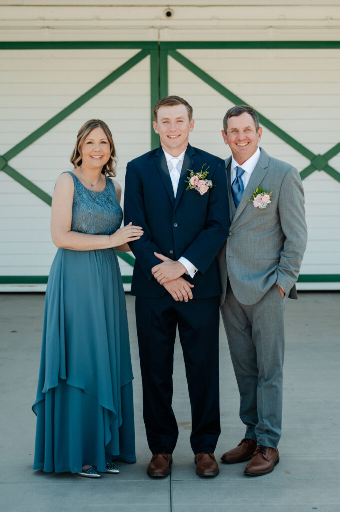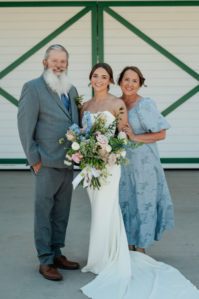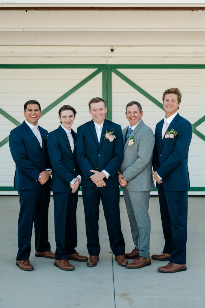 In front of the barn, highlighting the rustic elegance of the venue.