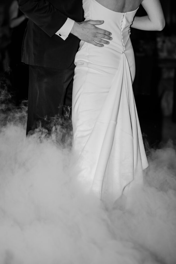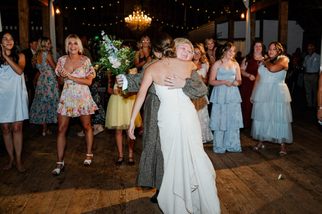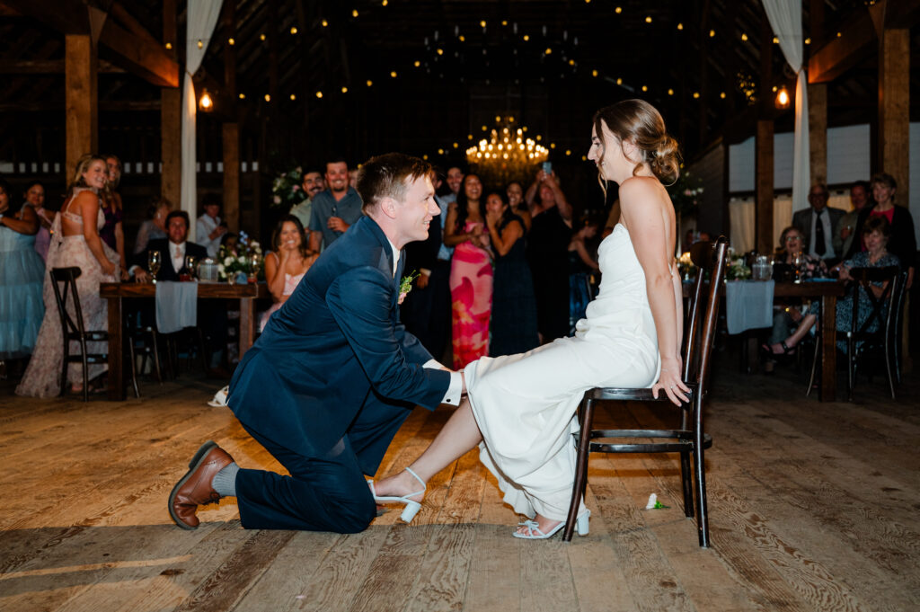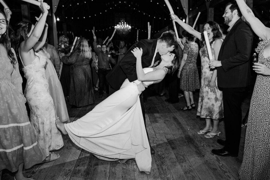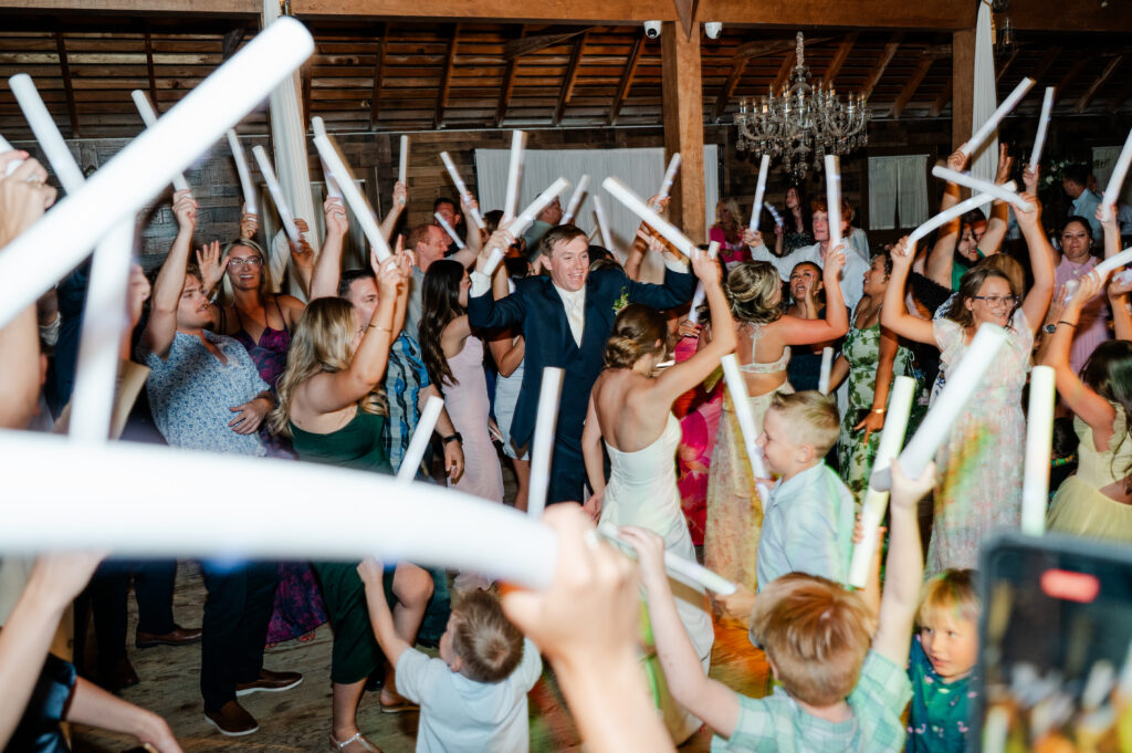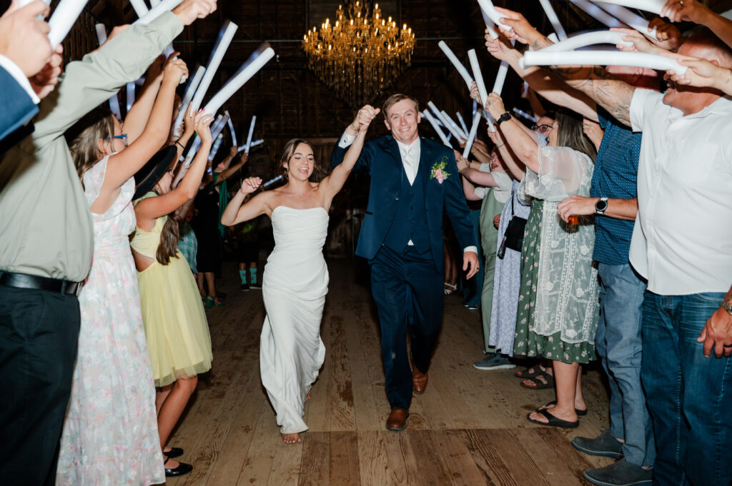 Guests enjoyed the garter and bouquet toss, cake cutting, and plenty of dancing before the couple made their unforgettable exit.