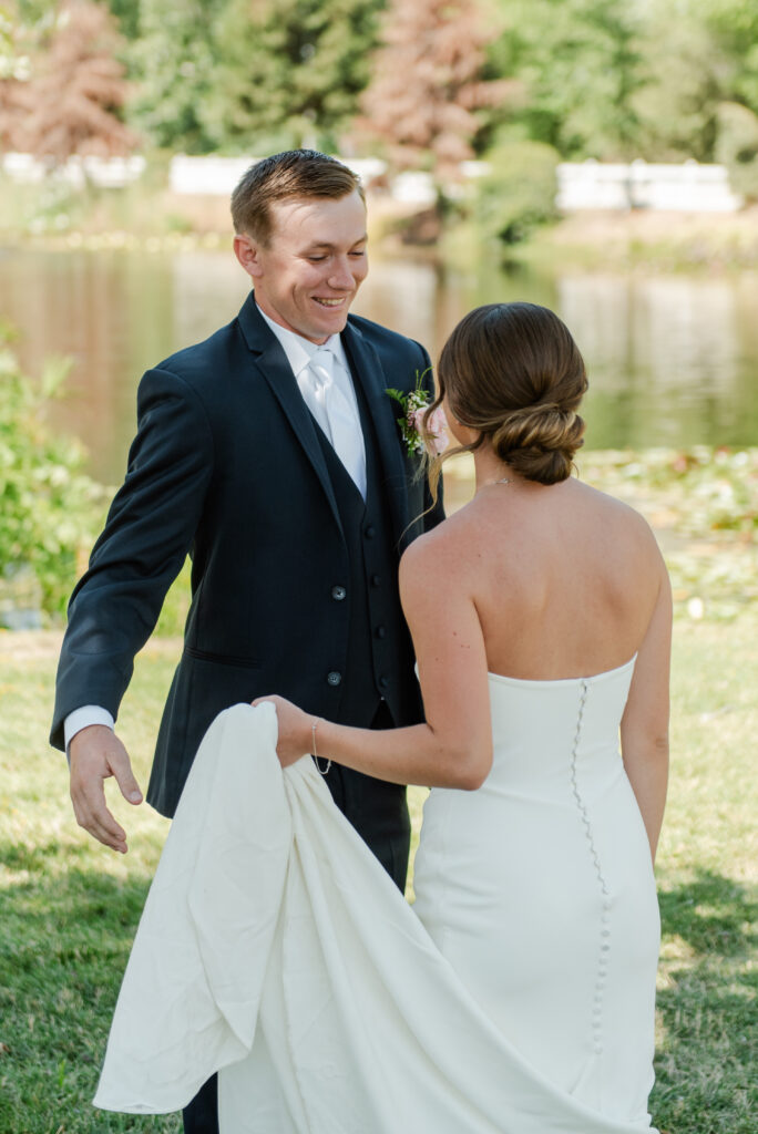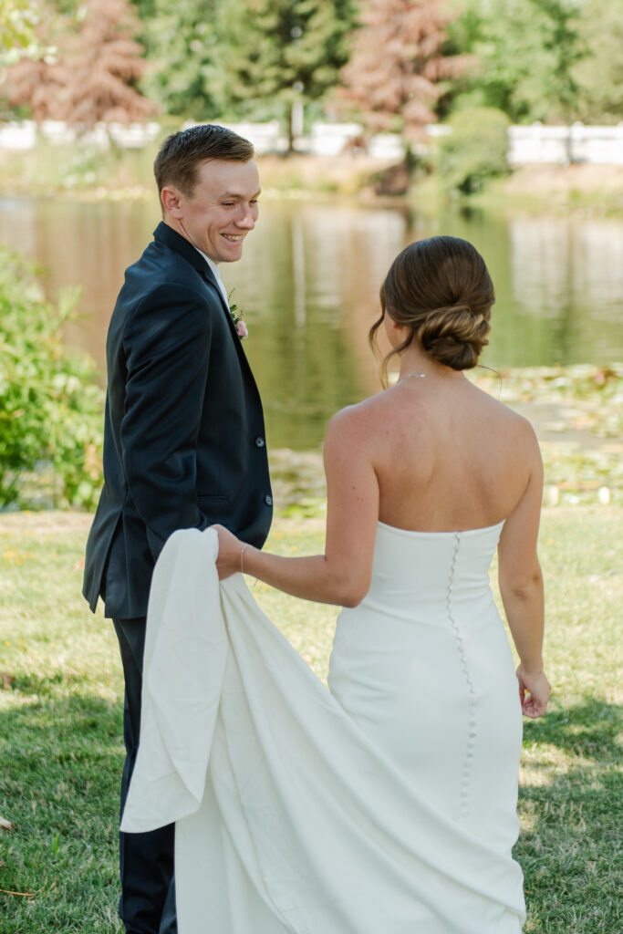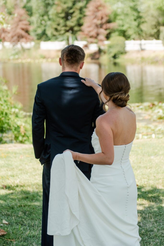On the lawn by the pond, where reflections and greenery made for a romantic backdrop.